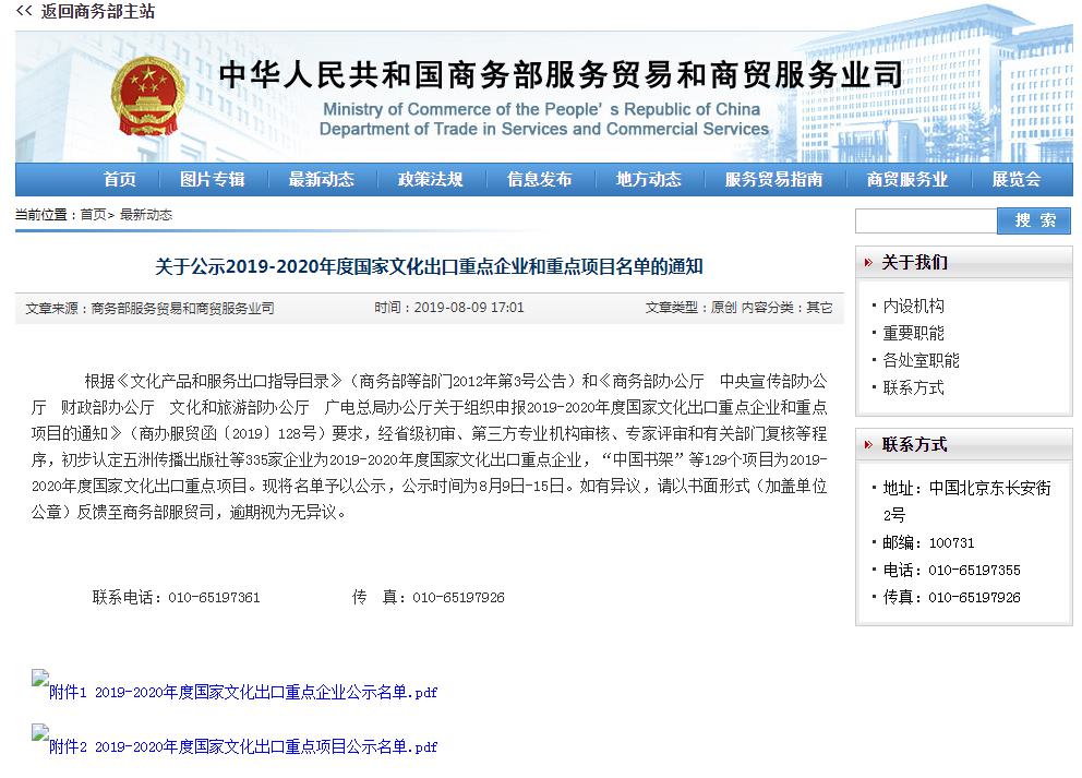 近日,國家商務(wù)部等五部委聯(lián)合發(fā)布了2019—2020年度國家文化出口重點項目名單,我社英爵意公司申報的東非華文傳媒建設(shè)項目成功入選,這也是湖北省唯一入選“國家文化出口重點項目”的出版項目。