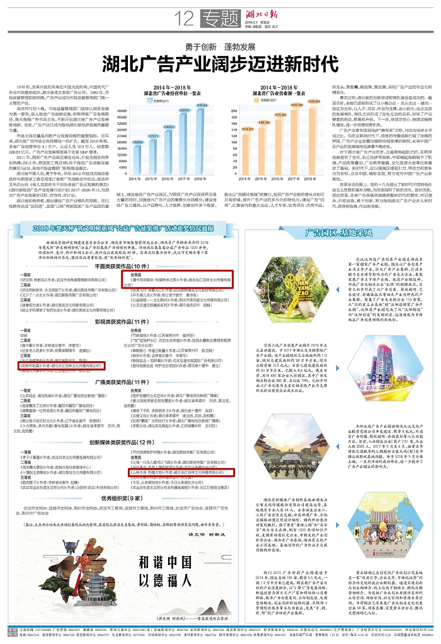 2019年2月1日湖北日?qǐng)?bào)報(bào)道,崇文國(guó)際旗下啟林公司創(chuàng)意策劃和精心制作的《遵守共同規(guī)則 構(gòu)筑秩序之美》《陽(yáng)新布貼篇》《山林水澤 荊楚大地》3部公益廣告在2018年楚天杯“講文明樹新風(fēng)”公益廣告征集推廣活動(dòng)中再獲獎(jiǎng)項(xiàng)。