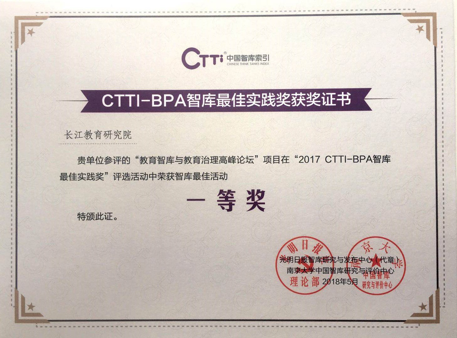 5月19日,由光明日報社和南京大學(xué)主辦的“2017CTTI-BPA智庫最佳實踐案例發(fā)布暨智庫評價系統(tǒng)研討會”在南京舉行。長江教育研究院2016年舉辦的“教育智庫與教育治理高峰論壇”榮獲智庫最佳活動一等獎。