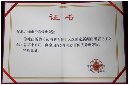 2018年5月30日,中宣部“2018年向全國青少年推薦百種優(yōu)秀出版物”新聞發(fā)布會在北京舉行,發(fā)布了“向全國青少年推薦百種優(yōu)秀出版物”入選書目。九通社出版的音像電子出版物《讀書的力量》成功入選。