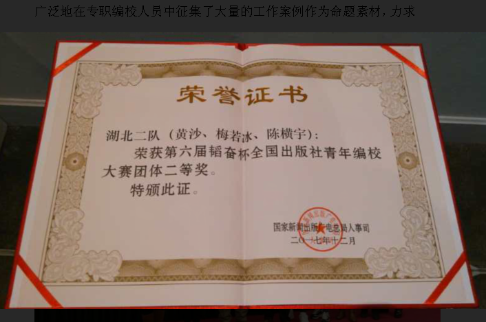 2017年12月2日,由國家新聞出版廣電總局主辦,中國出版協(xié)會、韜奮基金會、中國編輯學會承辦的第六屆韜奮杯全國出版社青年編校大賽在京落幕,我社參賽的青年員工陳橫宇所在的湖北二隊榮獲團體二等獎。