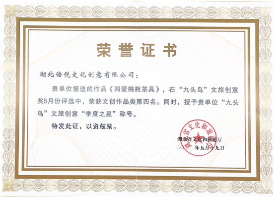 由湖北倍悅文化創(chuàng)意有限公司出品的四季之愛梅瓶茶具在2022年5月“九頭鳥”文旅創(chuàng)意獎中榮獲文創(chuàng)作品類目第四名。同時(shí)獲得 “九頭鳥”文旅創(chuàng)意“季度之星”稱號。
