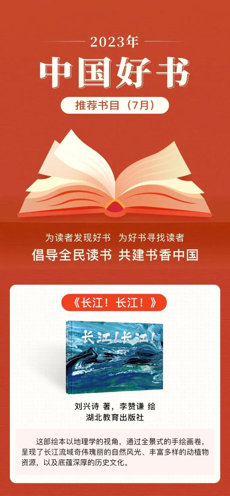 8月17日,由中宣部出版局指導(dǎo)、中國圖書評論學(xué)會組織評選的2023年“中國好書”7月榜單發(fā)布,湖北教育出版社出版的圖書《長江!長江!》成功入選。