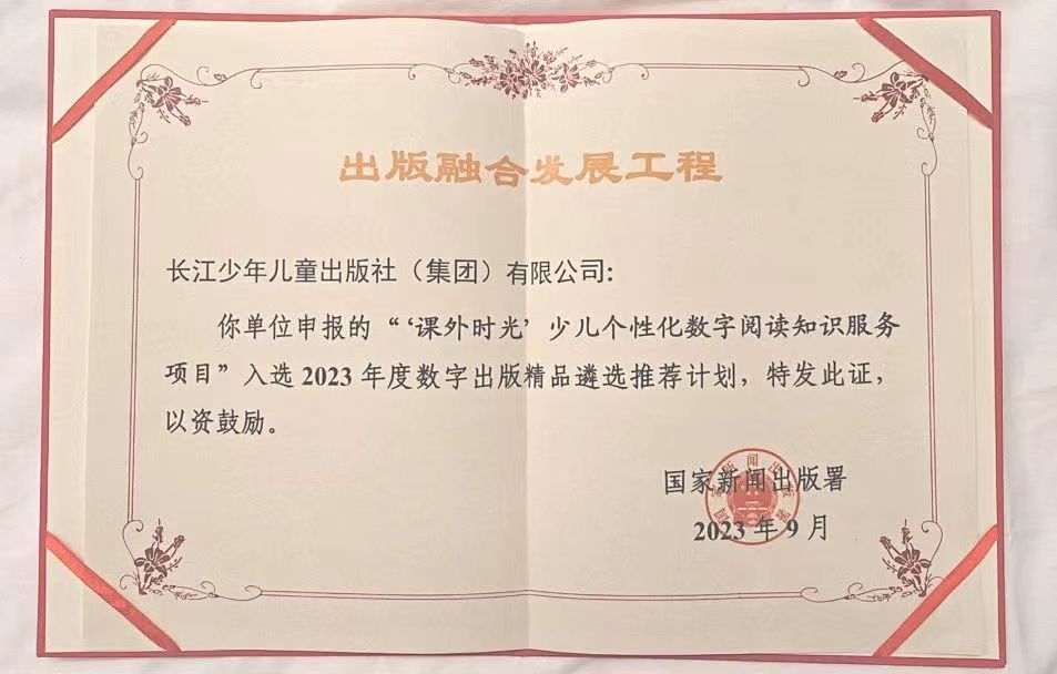 日前,國家新聞出版署公布了2023年度出版融合發(fā)展工程入選項目名單, 長江少年兒童出版社(集團)有限公司“課外時光”少兒個性化數(shù)字閱讀知識服務項目入選數(shù)字出版精品遴選推薦計劃,同時,長少集團還入選了“出版融合發(fā)展特色示范單位”。