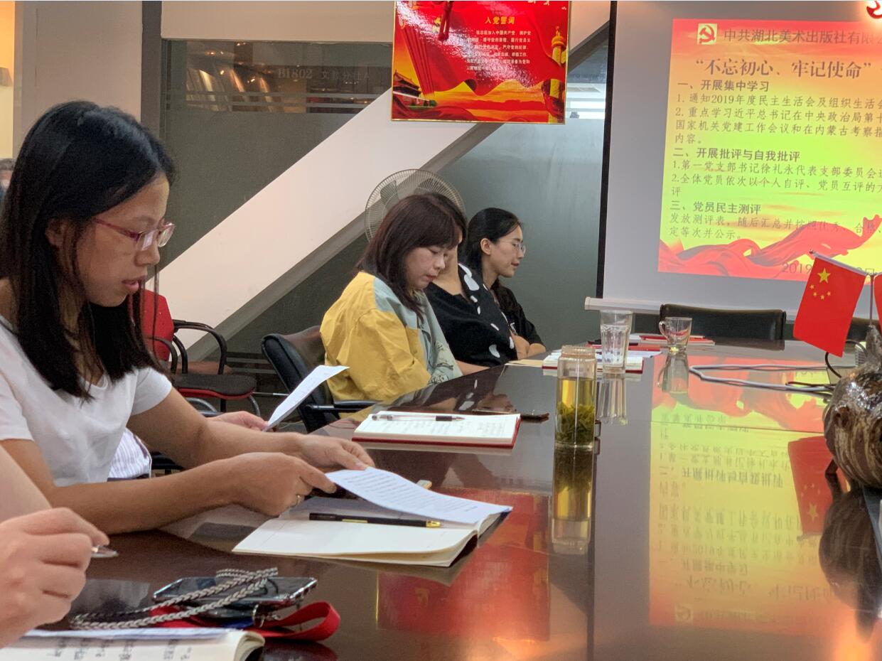 2019年8月30日湖北美術(shù)出版社在十八樓會(huì)議室舉行以“不忘初心、牢記使命”為主題的專題組織生活會(huì)。全體黨員開展了一次集中學(xué)習(xí),開展了批評(píng)與自我批評(píng),完成了黨員民主測評(píng)活動(dòng)。全體黨員在思想上受到洗禮,取得了良好的效果。