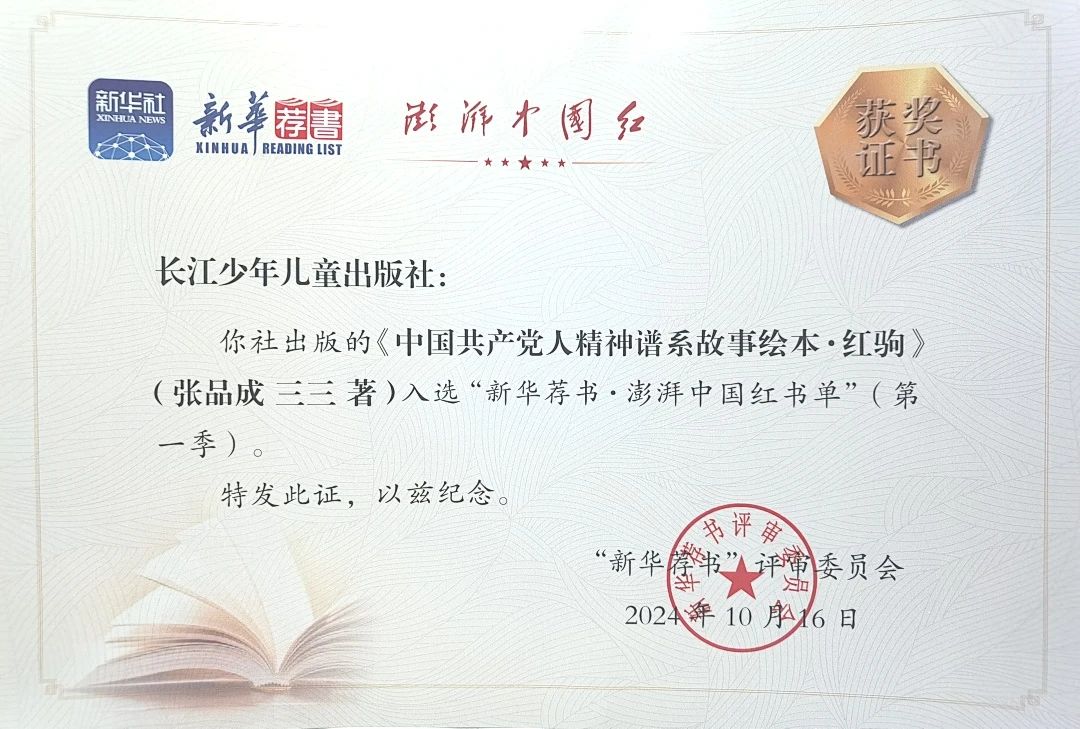 10月16日,“新華薦書?澎湃中國紅書單”(第一季)發(fā)布禮在浙江嘉興南湖發(fā)布廳舉行。經(jīng)過前期出版單位推薦、網(wǎng)絡(luò)投票和“新華薦書”評審委員會的評議,長江少年兒童出版社出版的《中國共產(chǎn)黨人精神譜系故事繪本·紅駒》和與甘肅人民出版社聯(lián)合出版的《雪線上的邊關(guān)》,兩種圖書入選該書單。