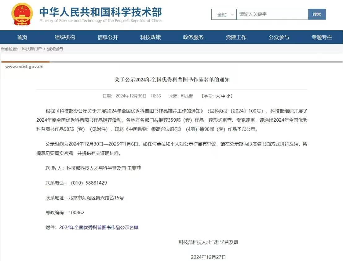 近日,科技部公布了2024年全國優(yōu)秀科普圖書作品名單,98部(套)作品從各地方各部門推薦的359部(套)作品中脫穎而出。其中,長江少年兒童出版社出版的《走近黃河科普讀物》入選。