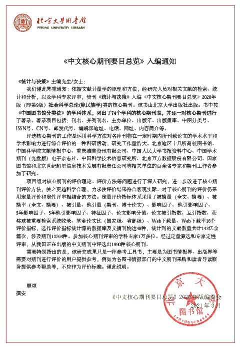 《統(tǒng)計(jì)與決策》連續(xù)第九次入編《中文核心期刊要目總覽》