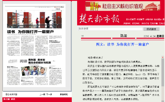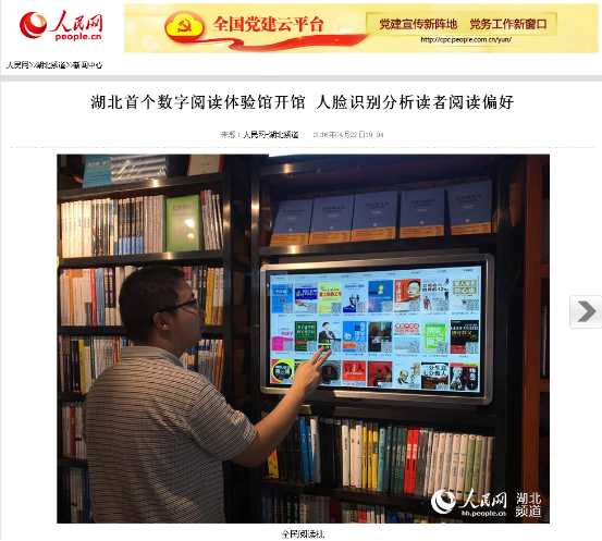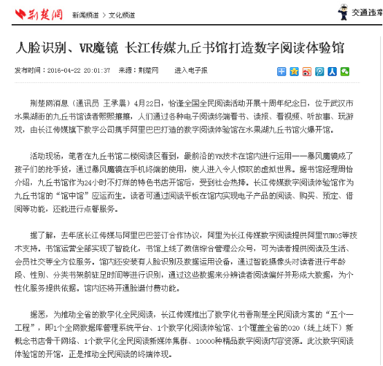 湖北日?qǐng)?bào)以《長(zhǎng)江傳媒攜手阿里巴巴 人臉識(shí)別數(shù)字閱讀館開(kāi)館》為題進(jìn)行報(bào)道,人民網(wǎng)、新華網(wǎng)、荊楚網(wǎng)、網(wǎng)易新聞、鳳凰網(wǎng)、中青網(wǎng)、中國(guó)日?qǐng)?bào)中文網(wǎng)等多家有影響力的網(wǎng)站也跟蹤報(bào)道。湖北網(wǎng)絡(luò)廣播電臺(tái)湖北之聲在《新聞聯(lián)播》、湖北衛(wèi)視在招牌欄目《湖北新聞》中都加以重點(diǎn)宣傳報(bào)道,多家媒體強(qiáng)強(qiáng)聯(lián)手,在全民閱讀日當(dāng)天,將數(shù)字化全民閱讀的概念推向高潮,深入人心。