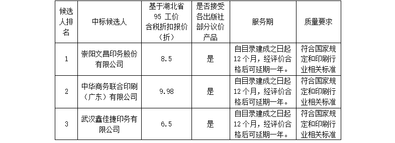 湖北省文化金融服務中心有限公司受湖北長江出版?zhèn)髅焦煞萦邢薰镜奈?,對長江出版?zhèn)髅焦煞萦邢薰就鈪f(xié)合作印刷廠目錄準入項目進行公開招標,評標委員會按照招標文件載明的評標方法已完成對各投標人遞交的投標文件的評審,根據評標結果,中標候選人公示如下: