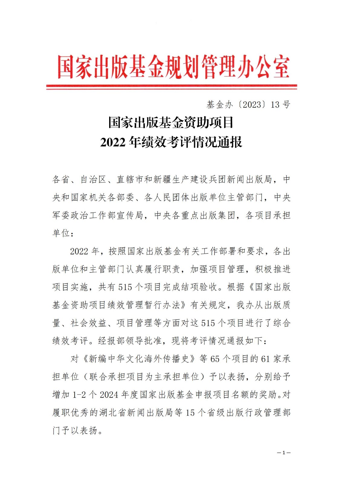 九通社喜獲國家出版基金資助項(xiàng)目2022年績效考評優(yōu)秀單位